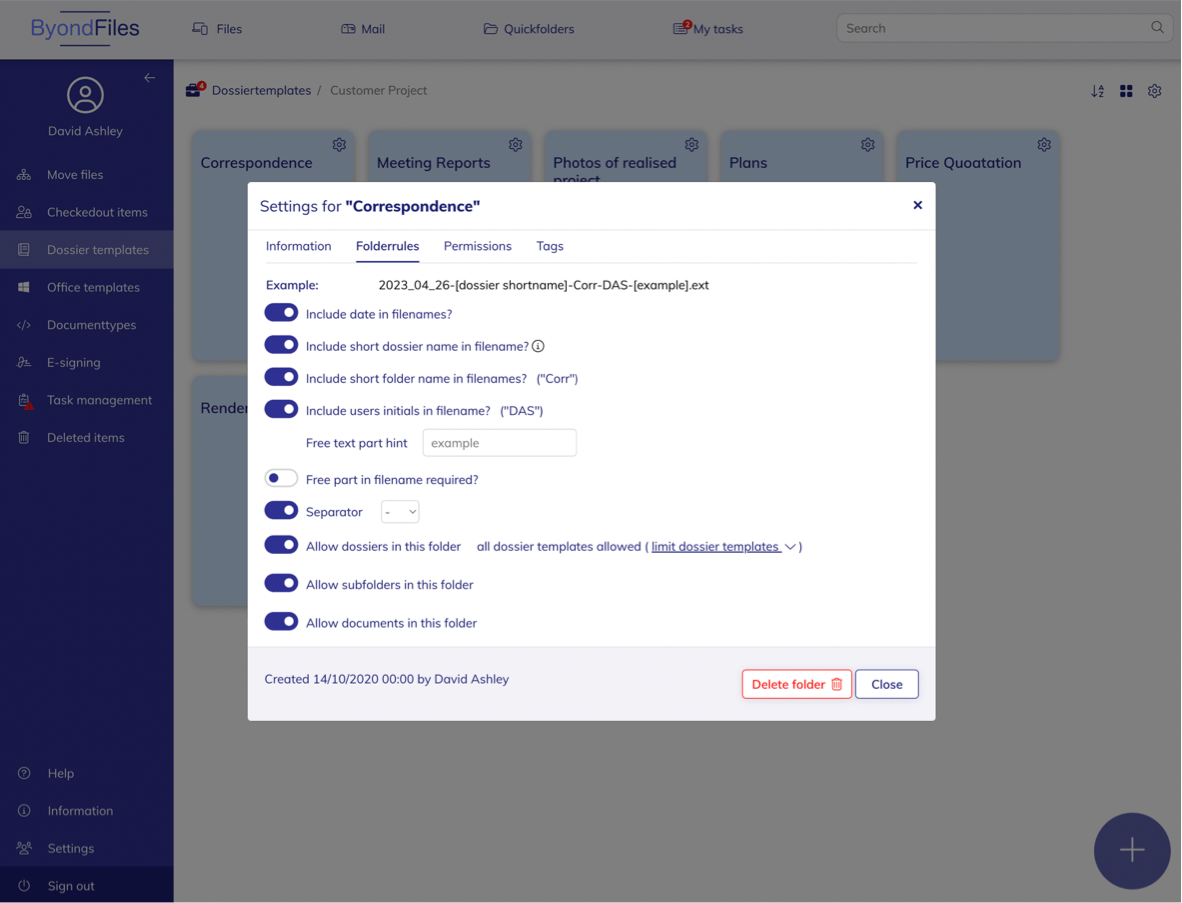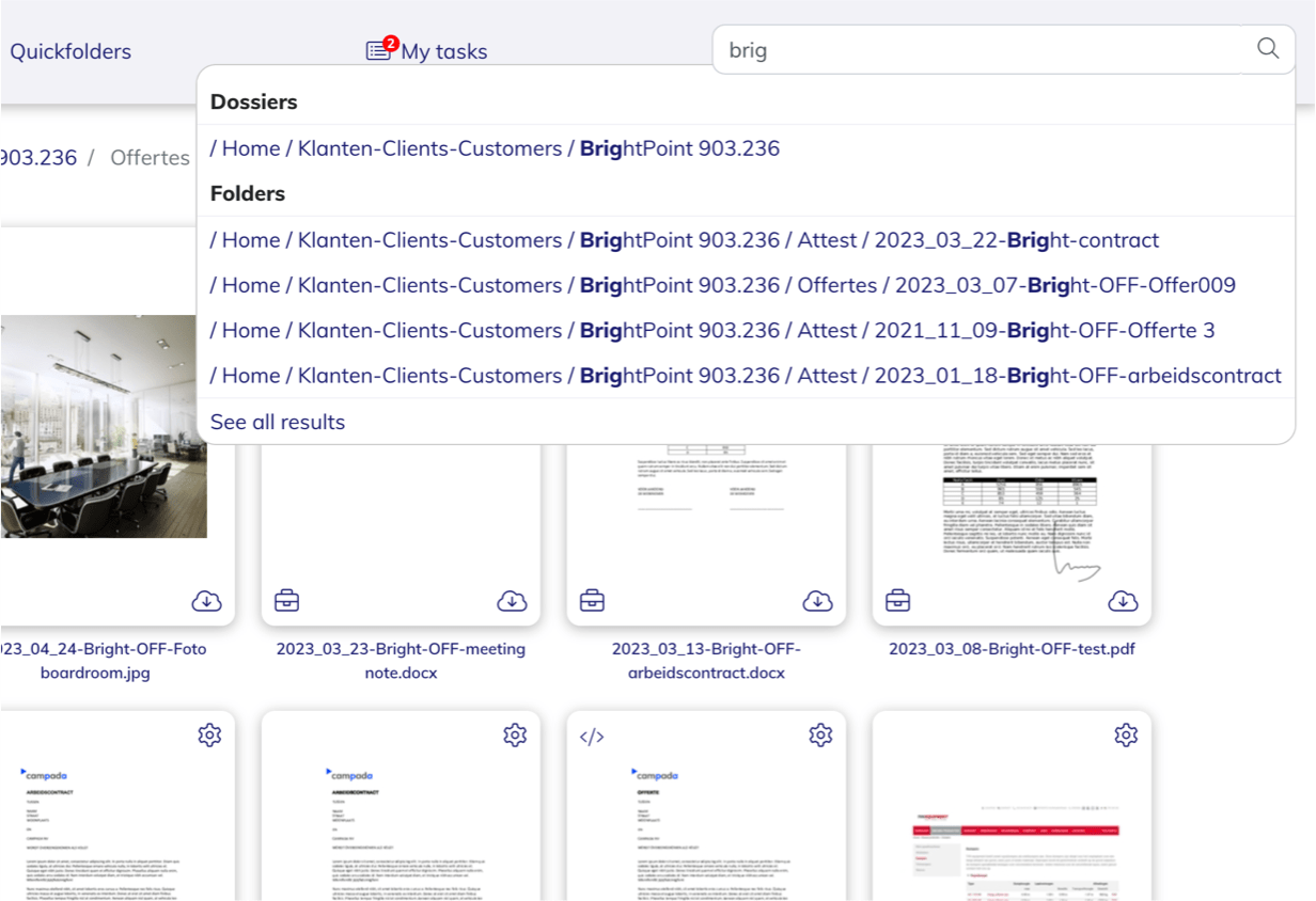 Searching in ByondFiles is fast and efficient. This is the result of the uniform naming conventions and clear dossier structure that ByondFiles offers. Assign tags to documents, dossiers and folders. You can freely configure these tags. Use tags to specify the status of a project, a customer type, an area...