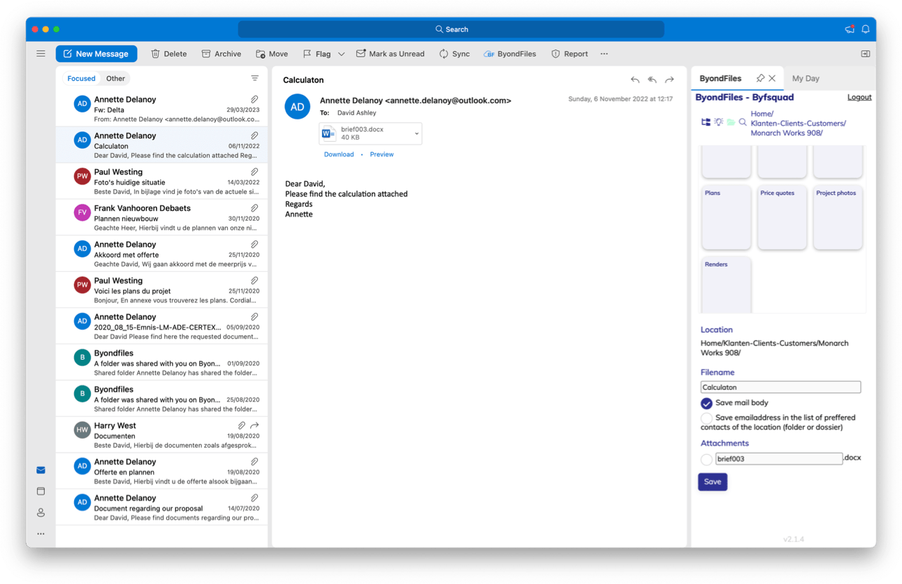 When an email arrives, ByondFiles helps store it in the file quickly by suggesting the correct file already in Outlook. Navigating and clicking in the file structure is much less necessary.
